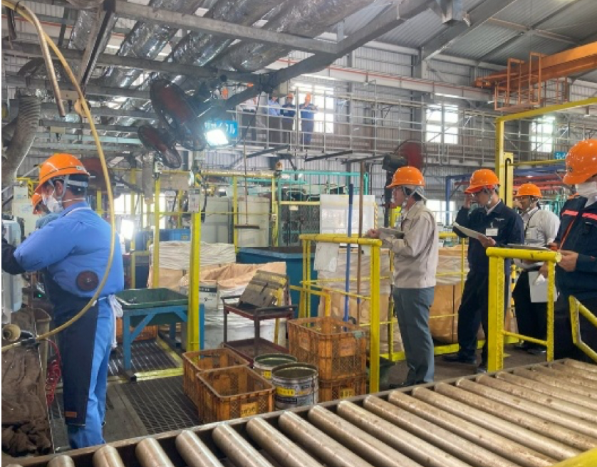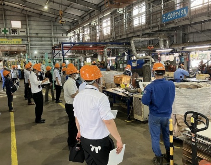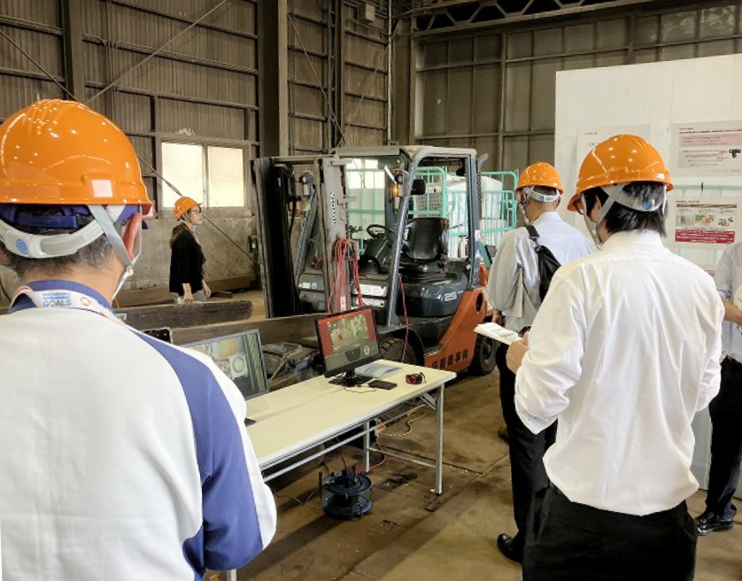 During the plant tour, participants visited Takunan Shoji Co., Ltd., where they observed safety and heat countermeasure initiatives, as well as new initiative such as live demonstrations of AI-powered safety support devices.